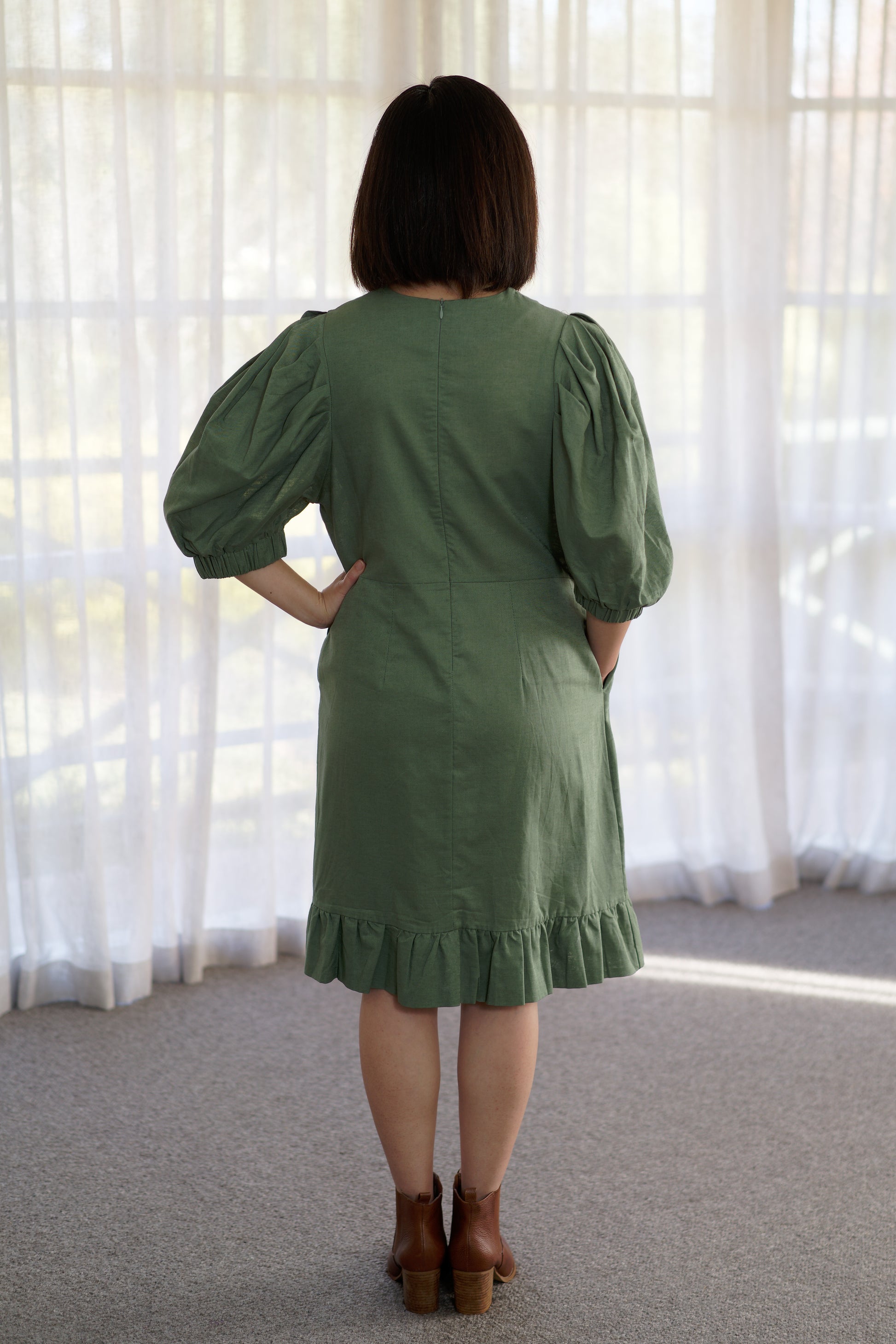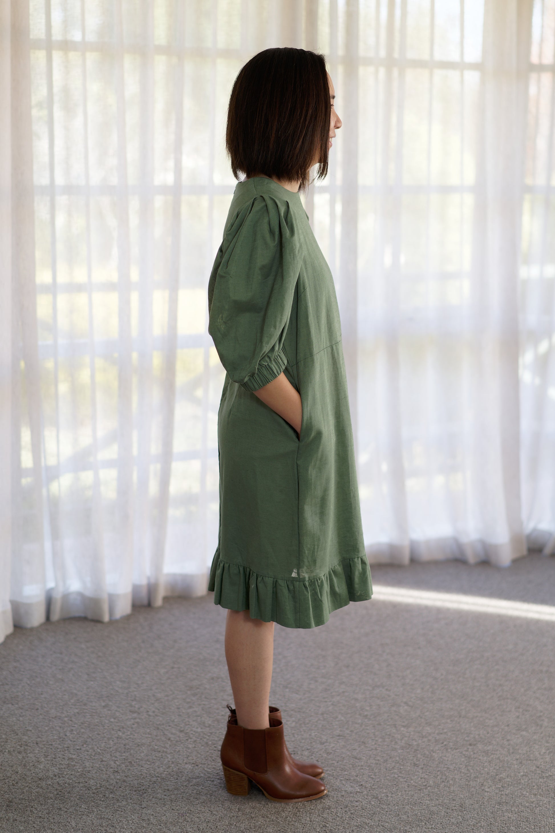 The Clover shift dress is a relaxed fit. With gathered sleeves and single ruffle hem, this provides a feminine touch on a classic staple. With pockets, this dress provides both comfort and functionality in one.